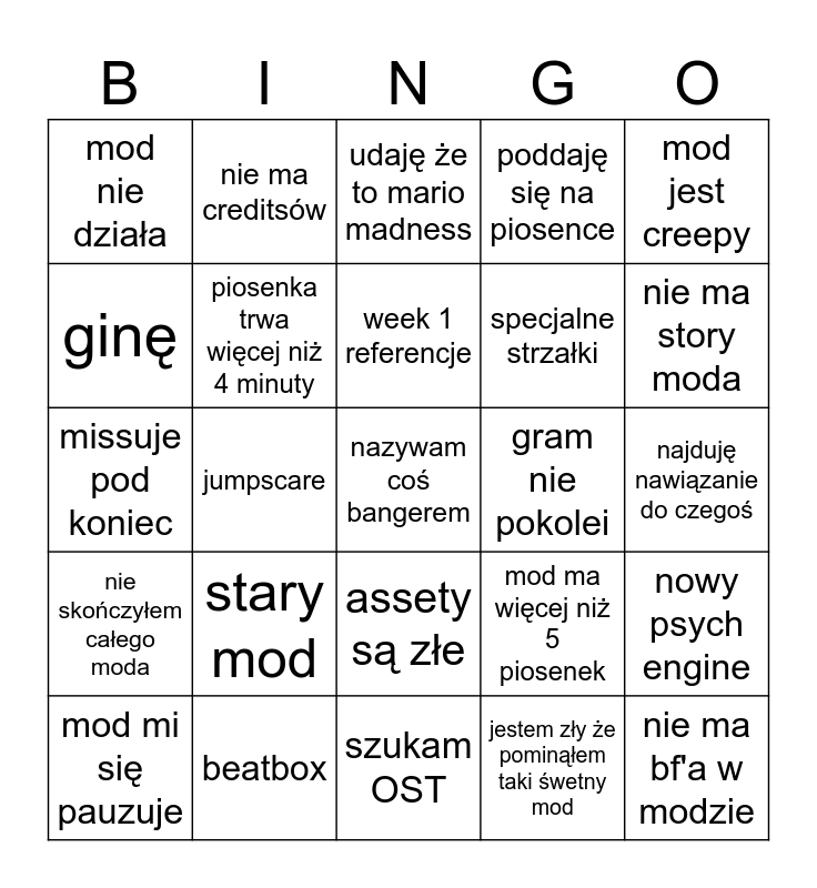 This bingo card has a free space and 24 words: stary mod, beatbox, week 1 referencje, mod mi się pauzuje, mod jest creepy, mod nie działa, ginę, nie ma creditsów, gram nie pokolei, assety są złe, specjalne strzałki, missuje pod koniec, mod ma więcej niż 5 piosenek, nowy psych engine, piosenka trwa więcej niż 4 minuty, jestem zły że pominąłem taki śwetny mod, najduję nawiązanie do czegoś, udaję że to mario madness, nie ma story moda, jumpscare, nie ma bf'a w modzie, nie skończyłem całego moda, poddaję się na piosence and szukam OST.
