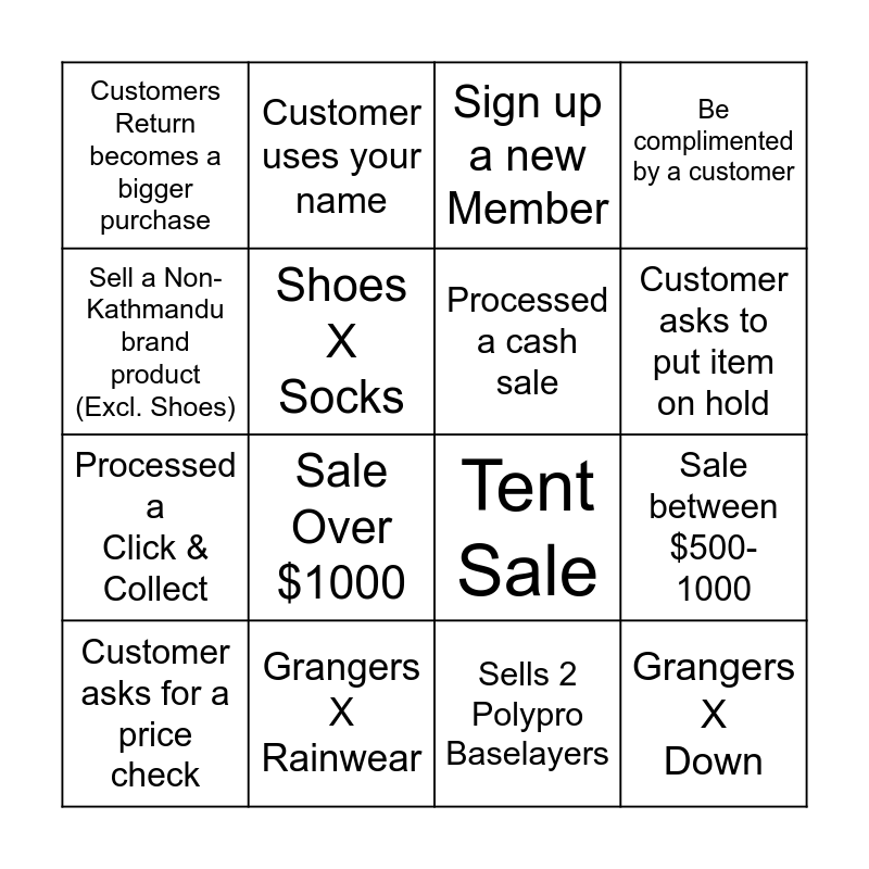 This bingo card has 16 words: Grangers X Rainwear, Sale between $500-1000, Sign up a new Member, Customers Return becomes a bigger purchase, Processed a Click & Collect, Customer uses your name, Tent Sale, Sells 2 Polypro Baselayers, Sell a Non-Kathmandu brand product (Excl. Shoes), Shoes X Socks, Customer asks for a price check, Be complimented by a customer, Sale Over $1000, Customer asks to put item on hold, Processed a cash sale and Grangers X Down.