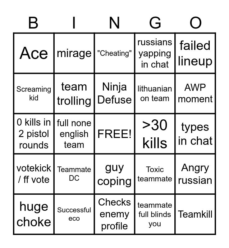 This bingo card has a free space and 24 words: Teammate DC, Successful eco, Ninja Defuse, huge choke, failed lineup, Ace, Screaming kid, mirage, >30 kills, guy coping, lithuanian on team, 0 kills in 2 pistol rounds, Toxic teammate, Angry russian, team trolling, teammate full blinds you, types in chat, "Cheating", AWP moment, full none english team, Teamkill, votekick / ff vote, russians yapping in chat and Checks enemy profile.
