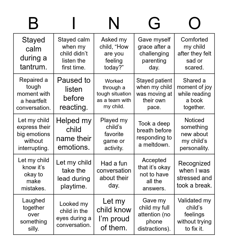 This bingo card has a free space and 29 words: Laughed together over something silly., Cuddled with my child after a busy day., Helped my child name their emotions., Paused to listen before reacting., Stayed calm during a tantrum., Asked my child, “How are you feeling today?”, Paused to listen before reacting., Let my child take the lead during playtime., Took a deep breath before responding to a meltdown., Looked my child in the eyes during a conversation., Noticed something new about my child’s personality., Validated my child’s feelings without trying to fix it., Let my child know I’m proud of them., Gave my child my full attention (no phone distractions)., Shared a moment of joy while reading a book together., Celebrated my child’s small victory with enthusiasm., Had a fun conversation about their day., Let my child know it’s okay to make mistakes., Comforted my child after they felt sad or scared., Let my child express their big emotions without interrupting., Accepted that it’s okay not to have all the answers., Apologized to my child after losing my temper., Stayed patient when my child was moving at their own pace., Repaired a tough moment with a heartfelt conversation., Gave myself grace after a challenging parenting day., Stayed calm when my child didn’t listen the first time., Recognized when I was stressed and took a break., Worked through a tough situation as a team with my child. and Shared something I love with my child..