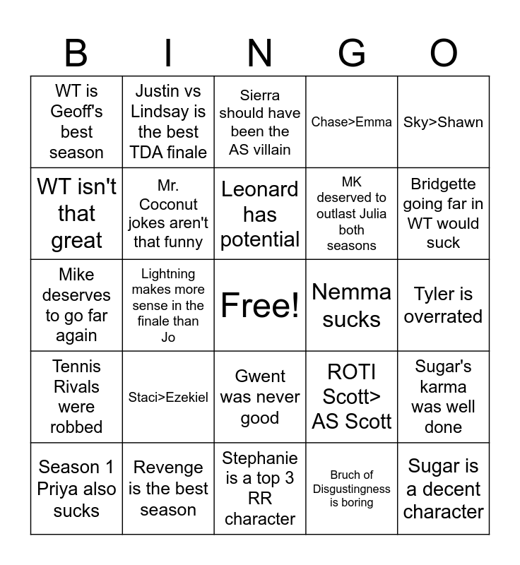 This bingo card has a free space and 24 words: Staci>Ezekiel, Revenge is the best season, Leonard has potential, Season 1 Priya also sucks, Sky>Shawn, WT is Geoff's best season, WT isn't that great, Justin vs Lindsay is the best TDA finale, Nemma sucks, Gwent was never good, MK deserved to outlast Julia both seasons, Mike deserves to go far again, ROTI Scott> AS Scott, Sugar's karma was well done, Mr. Coconut jokes aren't that funny, Bruch of Disgustingness is boring, Tyler is overrated, Sierra should have been the AS villain, Bridgette going far in WT would suck, Lightning makes more sense in the finale than Jo, Sugar is a decent character, Tennis Rivals were robbed, Chase>Emma and Stephanie is a top 3 RR character.