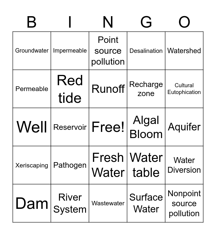 This bingo card has a free space and 26 words: Fresh Water, Surface Water, Runoff, River System, Watershed, Groundwater, Permeable, Impermeable, Aquifer, Water table, Recharge zone, Well, Water Diversion, Dam, Reservoir, Salination, Desalination, Xeriscaping, Point source pollution, Nonpoint source pollution, Cultural Eutophication, Wastewater, Algal Bloom, Pathogen, Red tide and Septic System.
