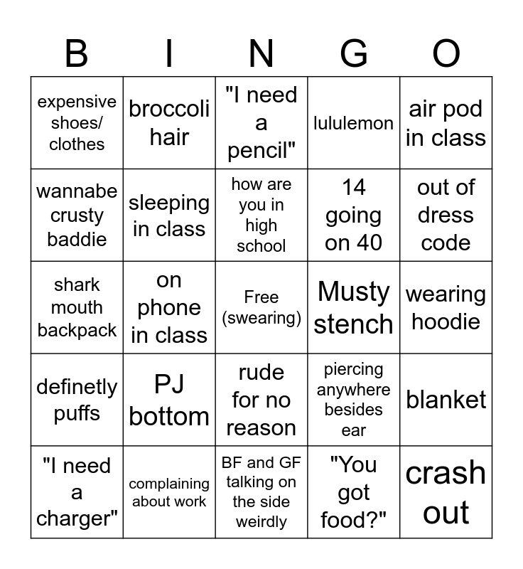 This bingo card has a free space and 28 words: blanket, back talking, 14 going on 40, "You got food?", wannabe crusty baddie, "I need a pencil", broccoli hair, definetly puffs, Musty stench, "I need a charger", shark mouth backpack, lululemon, complaining about work, BF and GF talking on the side weirdly, out of dress code, teacher using PowerPoint, PJ bottom, sleeping in class, how are you in high school, rude for no reason, expensive shoes/ clothes, dyed hair, crash out, on phone in class, wearing hoodie, piercing anywhere besides ear, air pod in class and cakey make-up.