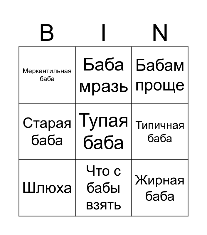 This bingo card has a free space and 8 words: Типичная баба, Бабам проще, Баба мразь, Шлюха, Меркантильная баба, Жирная баба, Старая баба and Что с бабы взять.