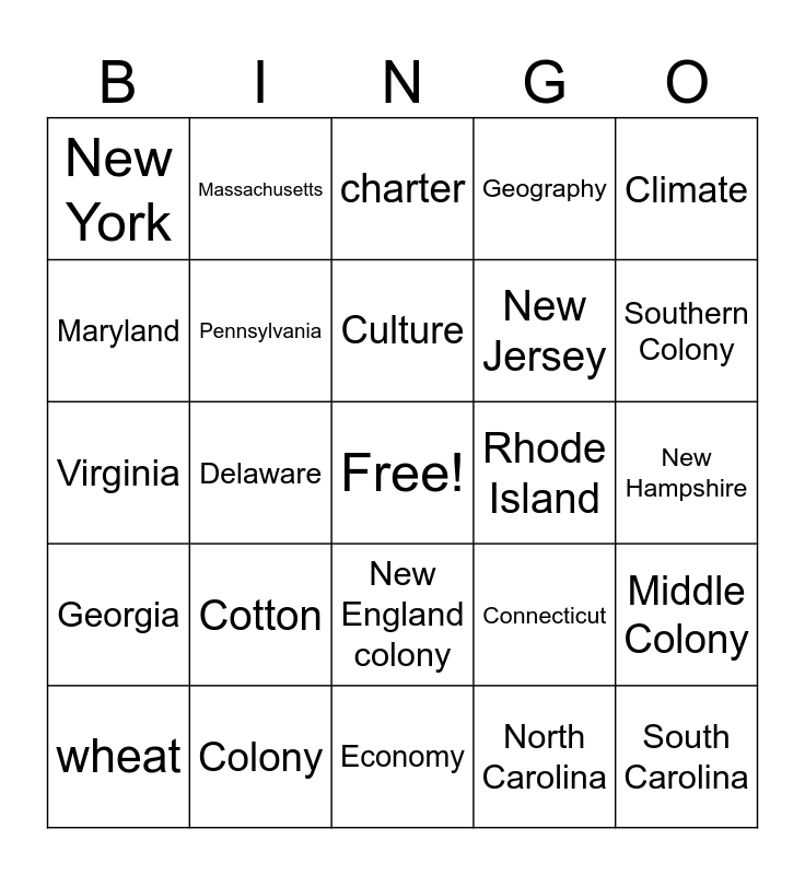 This bingo card has a free space and 24 words: Cotton, Colony, Culture, wheat, Climate, New York, Maryland, Massachusetts, Rhode Island, New England colony, New Jersey, Virginia, Connecticut, Middle Colony, Pennsylvania, North Carolina, New Hampshire, charter, Southern Colony, Delaware, South Carolina, Georgia, Geography and Economy.