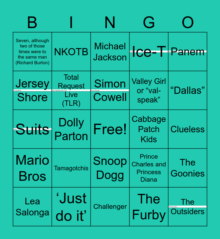 This bingo card has 15 images, a free space and 75 words: Darth Vadar, Elvis Priestly, Michael Jackson, Ariel, Elsa, The Simpsons, Star Trek, Scoops Ahoy!, Michael Scott, Keeping Up With the Kardashians, Love Is Blind, Ozzy Osbourne, Simon Cowell, Jersey Shore, Nirvana, Dolly Parton, Frodo Baggins, The Outsiders, Carrie, Panem, Jay-Z, Suits, Total Request Live (TLR), NKOTB, Ice-T, A physician, Bruce Wayne, Wakanda, Kryptonite, The TARDIS, The 1980 Winter Olympics hockey game, Coca-Cola, “Video Killed the Radio Star”, Prince Charles and Princess Diana, “Dallas”, Valley Girl or “val-speak”, Tonya Harding and Nancy Kerrigan, The Rachel, Clueless, The Furby, The Office, Apple, Tiger King, Dwayne “The Rock” Johnson, The Declaration of Independence, Nathan Lane, Lea Salonga, Seven, although two of those times were to the same man (Richard Burton), TikTok, Eggo Waffles, Flo, Snoop Dogg, iPod, Xbox, eHarmony, Myspace, Jessica Simpson, Scranton, Pennsylvania, Tiger Woods, McDonalds, Tamagotchis, Elmo, Spice Girls, Crimping, Mary Kate and Ashley Olsen, Cabbage Patch Kids, Chuck E. Cheese, Ghostbusters, DeLorean, The Goonies, Mario Bros, ‘Just do it’, Mullet, Challenger and A Scrunchie.