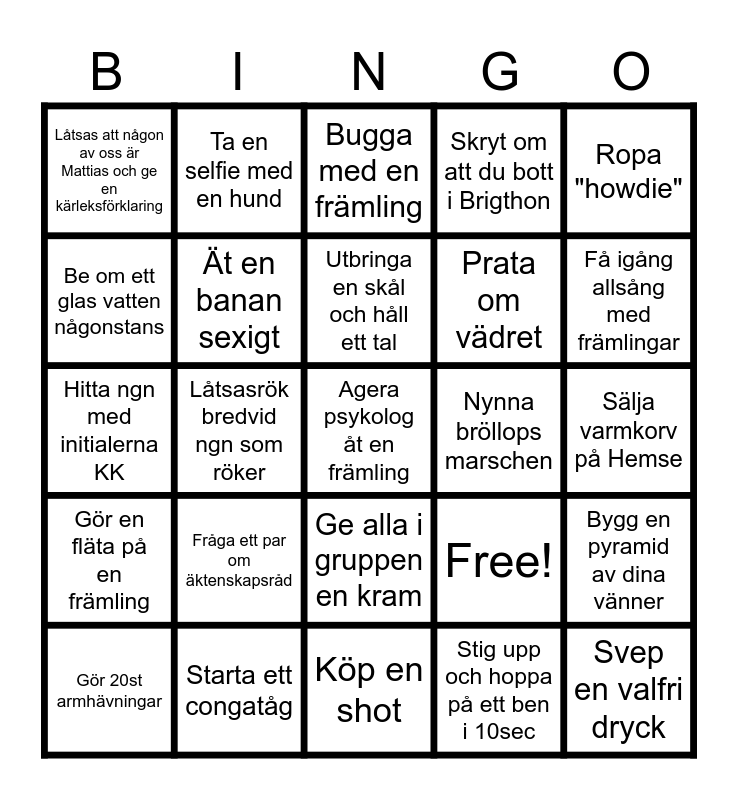 This bingo card has 25 words: Fråga ett par om äktenskapsråd, Köp en shot, Utbringa en skål och håll ett tal, Gör 20st armhävningar, Ropa "howdie", Låtsas att någon av oss är Mattias och ge en kärleksförklaring, Be om ett glas vatten någonstans, Ta en selfie med en hund, Nynna bröllops marschen, Ge alla i gruppen en kram, Prata om vädret, Hitta ngn med initialerna KK, Free!, Bygg en pyramid av dina vänner, Ät en banan sexigt, Svep en valfri dryck, Sälja varmkorv på Hemse, Bugga med en främling, Få igång allsång med främlingar, Låtsasrök bredvid ngn som röker, Agera psykolog åt en främling, Starta ett congatåg, Gör en fläta på en främling, Skryt om att du bott i Brigthon and Stig upp och hoppa på ett ben i 10sec.