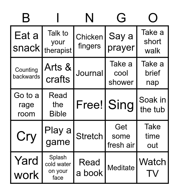 This bingo card has a free space and 50 words: Exercise, Watch TV, Watch a movie, Read a book, Play a game, Call a friend, Talk to your therapist, Deep breathing, Counting backwards, Grounding Technique, Arts & crafts, Say a prayer, Take time out, Get some fresh air, Practice Photography, Recite positive affirmations, Journal, Sing, Listen to music, Take a short walk, Read the Bible, Meditate, Eat a snack, Take a cool shower, Reorganize your space, Go shopping, Take a brief nap, Cook a meal, Chicken fingers, Stretch, Yoga, Listen to nature sounds, Make a to do list, Work on a puzzle, Splash cold water on your face, Drink something really cold, Tear up paper, Write a letter, Put on makeup, Soak in the tub, Aromatherapy, Pop bubble wrap, Yell into a pillow, Chew gum, Yard work, Go to a rage room, Drink a soda, Cuddle a pet, Cry and Make a vision board.