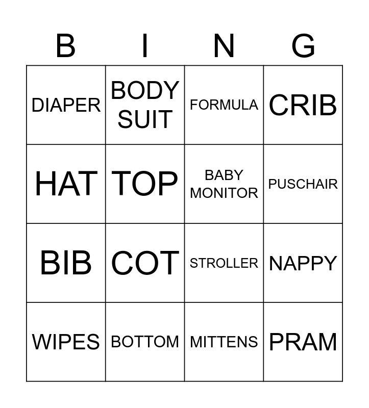 This bingo card has 24 words: POTTY, ROMPER SUIT, PUSCHAIR, BABY CARRIAGE, HAT, DIAPER, TOP, BODY SUIT, BOTTOM, PACIFIER, BIB, STROLLER, DUMMY, BOTTLE, BABY MONITOR, INFANT CAR SEAT, MITTENS, FORMULA, COT, NAPPY, WIPES, PRAM, CRIB and CHANGING BAG.