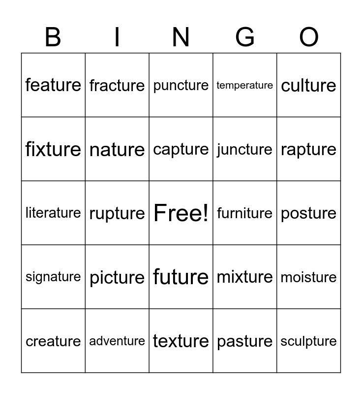 This bingo card has a free space and 24 words: picture, adventure, capture, creature, culture, feature, fixture, fracture, furniture, future, juncture, literature, mixture, moisture, nature, pasture, posture, puncture, rapture, rupture, sculpture, signature, temperature and texture.