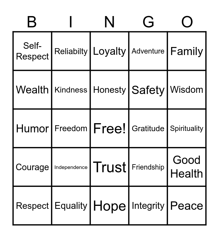 This bingo card has a free space and 24 words: Independence, Equality, Honesty, Respect, Family, Self-Respect, Wealth, Reliabilty, Gratitude, Trust, Safety, Humor, Friendship, Good Health, Kindness, Integrity, Spirituality, Loyalty, Wisdom, Freedom, Peace, Courage, Adventure and Hope.