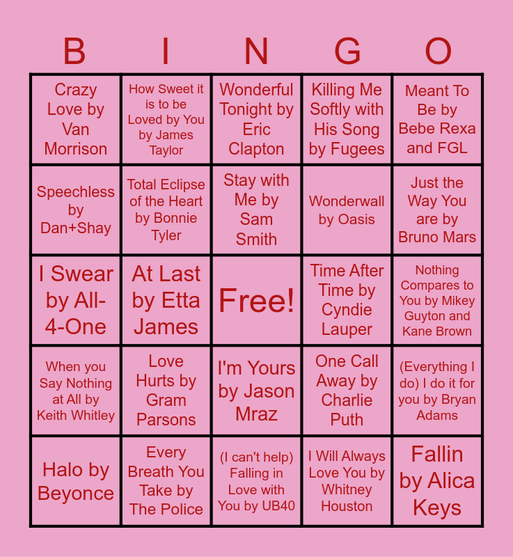 This bingo card has a free space and 43 words: Stay with Me by Sam Smith, At Last by Etta James, How Deep is Your Love by The Bee Gees, I Will Always Love You by Whitney Houston, Perfect by Ed Sheeran, Halo by Beyonce, Total Eclipse of the Heart by Bonnie Tyler, My Girl by Otis Redding, Killing Me Softly with His Song by Fugees, You're Still the One by Shinia Twain, Crazy Love by Van Morrison, Love Hurts by Gram Parsons, One Call Away by Charlie Puth, (Everything I do) I do it for you by Bryan Adams, Iris by The Goo Goo Dolls, Thinking Out Loud by Ed Sheeran, Meant to Be by Bebe Rexa, Time After Time by Cyndie Lauper, Let's Get it On by Marvin Gaye, I Swear by All-4-One, How Sweet it is to be Loved by You by James Taylor, Unforgettable by Nat King Cole, It Girl by Jason Derulo, Meant To Be by Bebe Rexa and FGL, Stand By Me by Ben E. King, Every Breath You Take by The Police, I'm Yours by Jason Mraz, Because You Loved Me by Celine Dion, Fallin by Alica Keys, When you Say Nothing at All by Keith Whitley, All of Me by John Legend, Stay with Me by Sam Smith, A Thousand Years by Christina Perri, Nothing Compares to You by Mikey Guyton and Kane Brown, Can You Feel the Love by Elton John, Leave the Door Open by Bruno Mars, (I can't help) Falling in Love with You by UB40, Wonderwall by Oasis, Just the Way You are by Bruno Mars, Speechless by Dan+Shay, At My Worst by Pink Sweat$, Wonderful Tonight by Eric Clapton and I'll Be There by Jess Glynne.