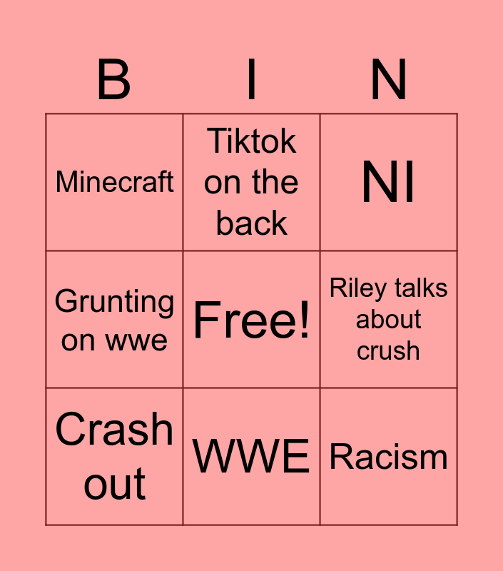 This bingo card has a free space and 8 words: Riley talks about crush, NI, Tiktok on the back, Crash out, Minecraft, Racism, Grunting on wwe and WWE.