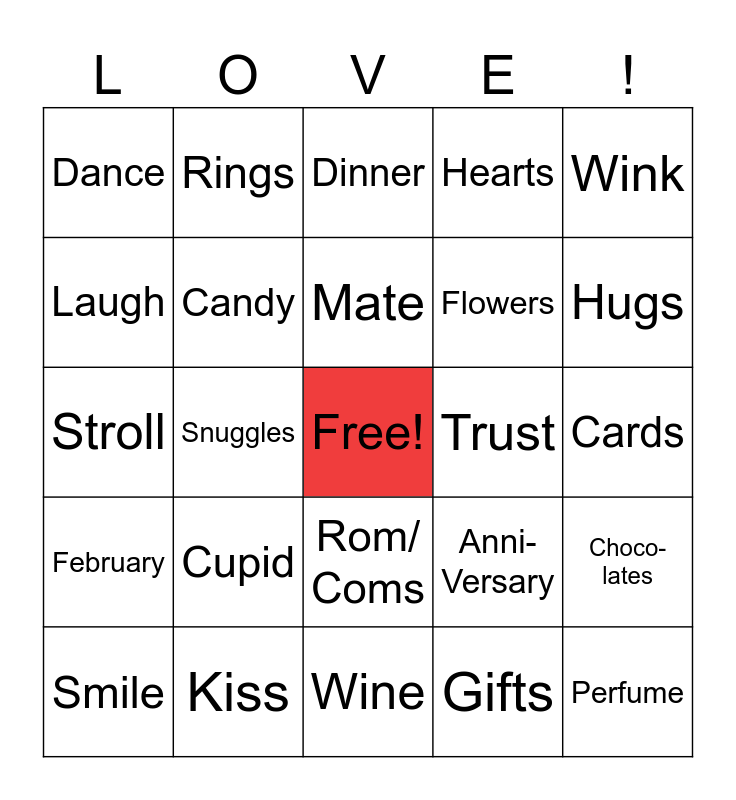 This bingo card has a free space and 24 words: Cupid, Kiss, Mate, Smile, Wink, Dance, Laugh, Rings, Trust, Rom/ Coms, Flowers, Stroll, Anni- Versary, Choco- lates, Candy, Gifts, Cards, Dinner, Hugs, Snuggles, Perfume, February, Hearts and Wine.