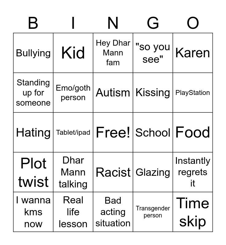 This bingo card has a free space and 24 words: Dhar Mann talking, Real life lesson, Autism, I wanna kms now, Karen, Bullying, Standing up for someone, Kid, School, Racist, Kissing, Hating, Glazing, Instantly regrets it, Emo/goth person, Transgender person, Food, Hey Dhar Mann fam, PlayStation, Tablet/ipad, Time skip, Plot twist, "so you see" and Bad acting situation.