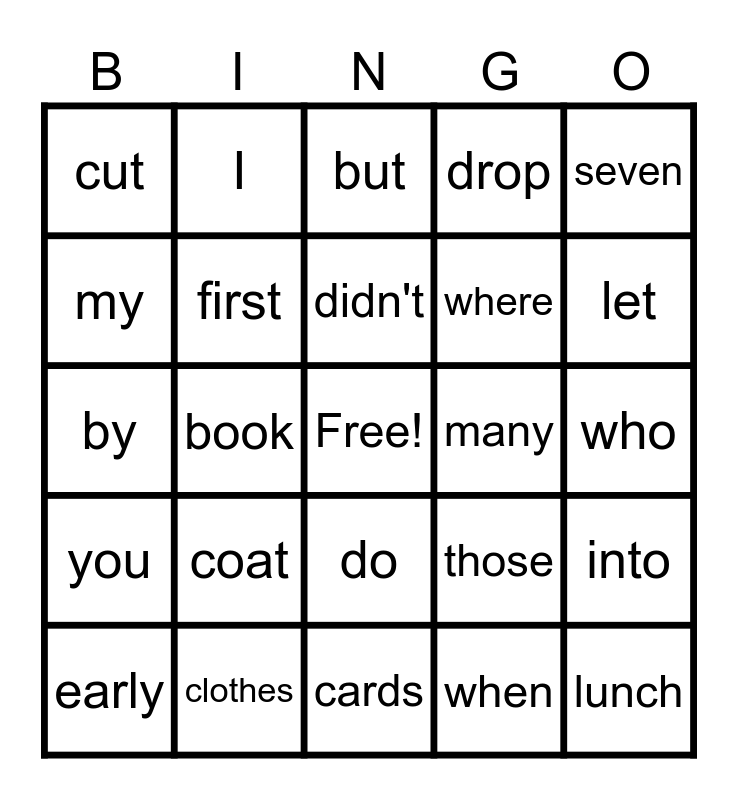 This bingo card has a free space and 24 words: coat, clothes, didn't, early, seven, cut, my, I, many, do, where, by, those, into, first, when, who, but, let, book, lunch, you, drop and cards.