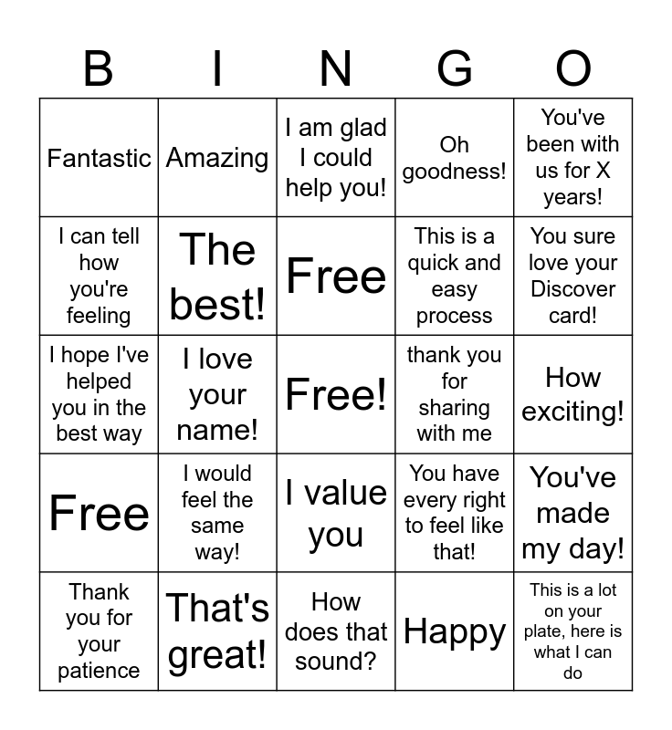 This bingo card has a free space and 24 words: I would feel the same way!, That's great!, Free, Thank you for your patience, You've been with us for X years!, Fantastic, I can tell how you're feeling, Amazing, thank you for sharing with me, I value you, This is a quick and easy process, I hope I've helped you in the best way, You have every right to feel like that!, You've made my day!, The best!, Happy, How exciting!, I am glad I could help you!, You sure love your Discover card!, I love your name!, This is a lot on your plate, here is what I can do, Free, Oh goodness! and How does that sound?.