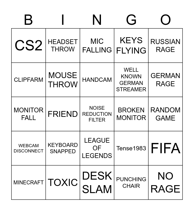 This bingo card has 25 words: KEYBOARD SNAPPED, DESK SLAM, HANDCAM, MINECRAFT, RUSSIAN RAGE, CS2, CLIPFARM, HEADSET THROW, BROKEN MONITOR, LEAGUE OF LEGENDS, WELL KNOWN GERMAN STREAMER, MONITOR FALL, Tense1983, FIFA, MOUSE THROW, NO RAGE, RANDOM GAME, MIC FALLING, GERMAN RAGE, FRIEND, NOISE REDUCTION FILTER, TOXIC, WEBCAM DISCONNECT, KEYS FLYING and PUNCHING CHAIR.