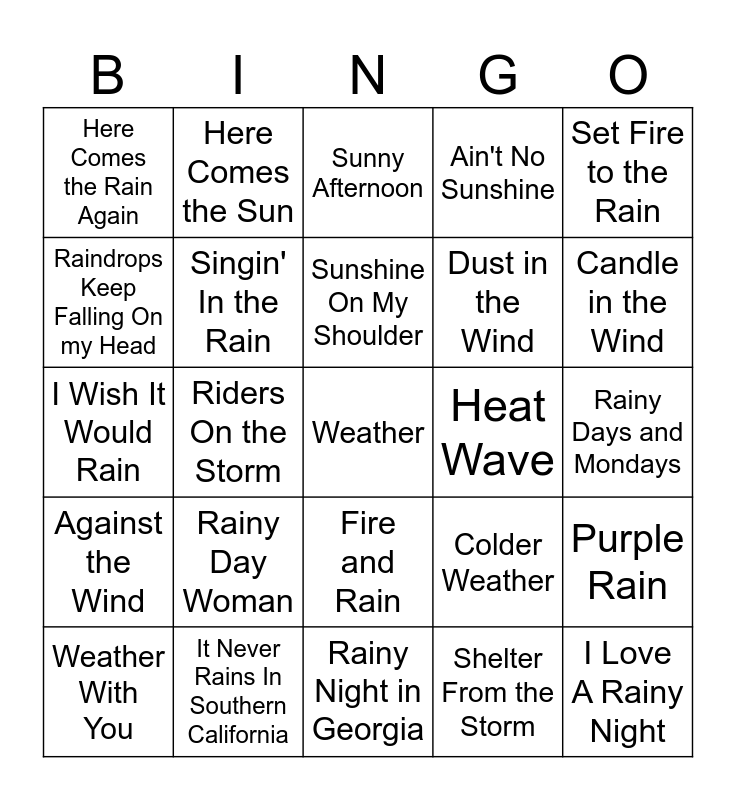This bingo card has a free space and 50 words: Rock You Like a Hurricane, I Love A Rainy Night, Songs About Rain, Rainy Night in Georgia, Rainy Day Woman, It's Raining Men, Here Comes the Sun, The Thunder Rolls, Raindrops Keep Falling On my Head, Have You Ever Seen the Rain?, Singin' In the Rain, Ain't No Sunshine, Purple Rain, Colder Weather, Blowin' In the Wind, Walking On Sunshine, Sunshine On My Shoulder, Heat Wave, The Wind Cries Mary, Set Fire to the Rain, Riders On the Storm, Shelter From the Storm, Here Comes the Rain Again, Dust in the Wind, Cruel Summer, November Rain, Candle in the Wind, Sunshine of Your Love, Sunny Afternoon, Fire and Rain, Smoky Mountain Rain, Blame It on The Weatherman, Do You Want to Build a Snowman?, A Foggy Day, It Never Rains In Southern California, I've Got My Love to Keep Me Warm, Let It Snow, Like The Rain, Rain Is a Good Thing, Rainy Days and Mondays, Raining on Sunday, Sun is Shining, Thunder, Umbrella, Weather With You, I Wish It Would Rain, Weatherman, Seminole Wind, Against the Wind and Hurricane.