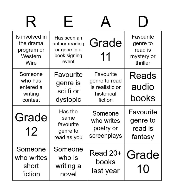 This bingo card has 16 words: Someone who is writing a novel, Favourite genre to read is fantasy, Grade 11, Is involved in the drama program or Western Wire, Grade 12, Has seen an author reading or gone to a book signing event, Someone who writes poetry or screenplays, Read 20+ books last year, Someone who has entered a writing contest, Favourite genre is sci fi or dystopic, Someone who writes short fiction, Favourite genre to read is mystery or thriller, Has the same favourite genre to read as you, Reads audio books, Favourite genre to read is realistic or historical fiction and Grade 10.