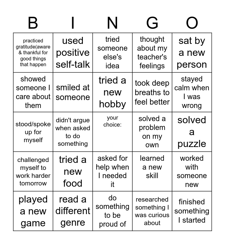 This bingo card has a free space and 24 words: tried a new food, read a different genre, tried a new hobby, played a new game, sat by a new person, practiced gratitude(aware & thankful for good things that happen, showed someone I care about them, used positive self-talk, solved a problem on my own, asked for help when I needed it, took deep breaths to feel better, stood/spoke up for myself, learned a new skill, worked with someone new, smiled at someone, researched something I was curious about, solved a puzzle, tried someone else's idea, stayed calm when I was wrong, didn't argue when asked to do something, finished something I started, challenged myself to work harder tomorrow, thought about my teacher's feelings and do something to be proud of.