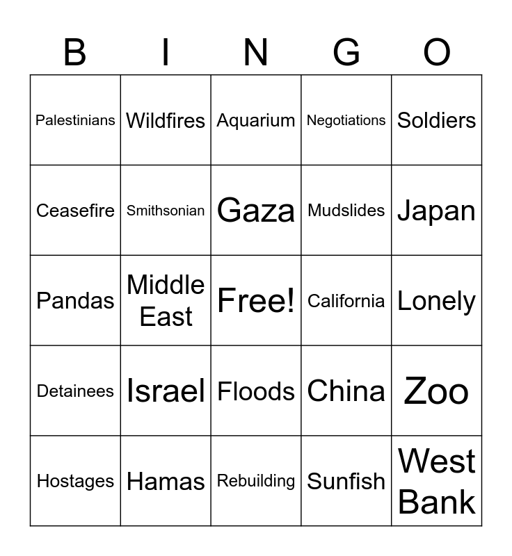 This bingo card has a free space and 24 words: Israel, Hamas, Gaza, Hostages, Soldiers, Palestinians, Ceasefire, Wildfires, California, Floods, Mudslides, Pandas, China, Zoo, Smithsonian, Sunfish, Lonely, Aquarium, Japan, Middle East, West Bank, Detainees, Negotiations and Rebuilding.