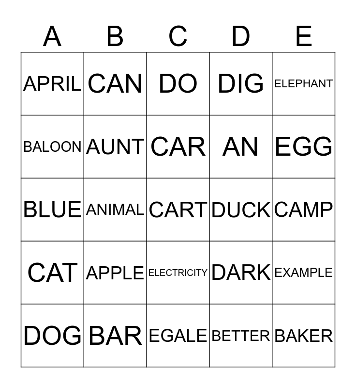 This bingo card has a free space and 24 words: APPLE, BAR, CAR, DOG, ELEPHANT, APRIL, BALOON, CAN, DUCK, ELECTRICITY, AN, BLUE, DARK, EXAMPLE, AUNT, BETTER, CAMP, DO, EGG, ANIMAL, BAKER, CAT, DIG and EGALE.