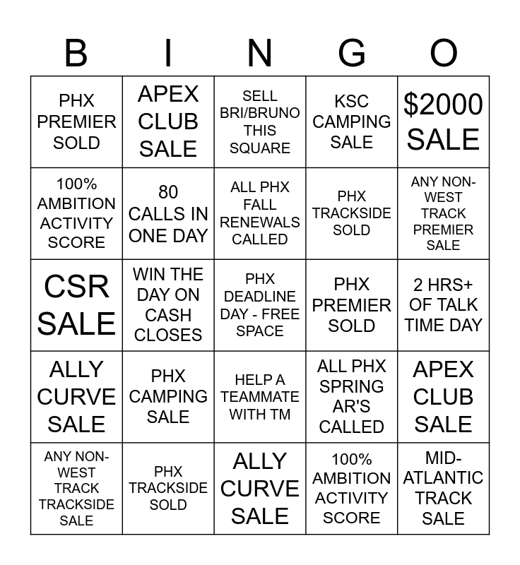 This bingo card has a free space and 24 words: ANY NON-WEST TRACK TRACKSIDE SALE, PHX CAMPING SALE, ALL PHX FALL RENEWALS CALLED, 100% AMBITION ACTIVITY SCORE, $2000 SALE, PHX PREMIER SOLD, APEX CLUB SALE, SELL BRI/BRUNO THIS SQUARE, PHX PREMIER SOLD, 2 HRS+ OF TALK TIME DAY, CSR SALE, 80 CALLS IN ONE DAY, ALL PHX SPRING AR'S CALLED, APEX CLUB SALE, 100% AMBITION ACTIVITY SCORE, PHX TRACKSIDE SOLD, ALLY CURVE SALE, KSC CAMPING SALE, ANY NON-WEST TRACK PREMIER SALE, ALLY CURVE SALE, WIN THE DAY ON CASH CLOSES, HELP A TEAMMATE WITH TM, PHX TRACKSIDE SOLD and MID-ATLANTIC TRACK SALE.
