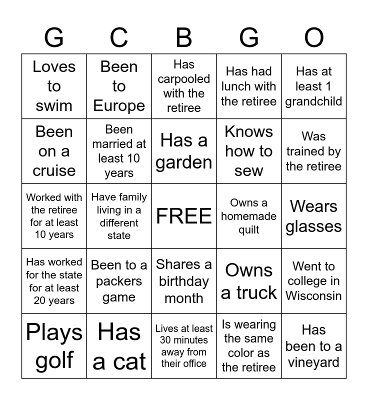 This bingo card has a free space and 24 words: Been to a packers game, Has a cat, Has a garden, Plays golf, Has at least 1 grandchild, Loves to swim, Been on a cruise, Been to Europe, Owns a homemade quilt, Shares a birthday month, Knows how to sew, Worked with the retiree for at least 10 years, Owns a truck, Went to college in Wisconsin, Been married at least 10 years, Is wearing the same color as the retiree, Wears glasses, Has carpooled with the retiree, Was trained by the retiree, Have family living in a different state, Has been to a vineyard, Has worked for the state for at least 20 years, Has had lunch with the retiree and Lives at least 30 minutes away from their office.