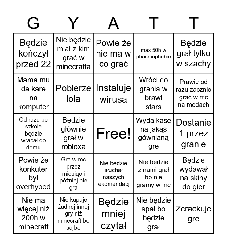 This bingo card has a free space and 24 words: Gra w mc przez miesiąc i później nie gra, Nie kupuje żadnej innej gry niż minecraft bo są be, Instaluje wirusa, Nie ma więcej niż 200h w minecraft, Będzie grał tylko w szachy, Będzie kończył przed 22, Mama mu da kare na komputer, Nie będzie miał z kim grać w minecrafta, Wyda kase na jakąś gównianą gre, Nie będzie słuchał naszych rekomendacji, Wróci do grania w brawl stars, Od razu po szkole będzie wracał do domu, Nie będzie z nami grał bo nie gramy w mc, Będzie wydawał na skiny do gier, Pobierze lola, Nie będzie spał bo będzie grał, Dostanie 1 przez granie, Powie że nie ma w co grać, Prawie od razu zacznie grać w mc na modach, Będzie głównie grał w robloxa, Zcrackuje gre, Powie że konkuter był overhyped, max 50h w phasmophobie and Będzie mniej czytał.