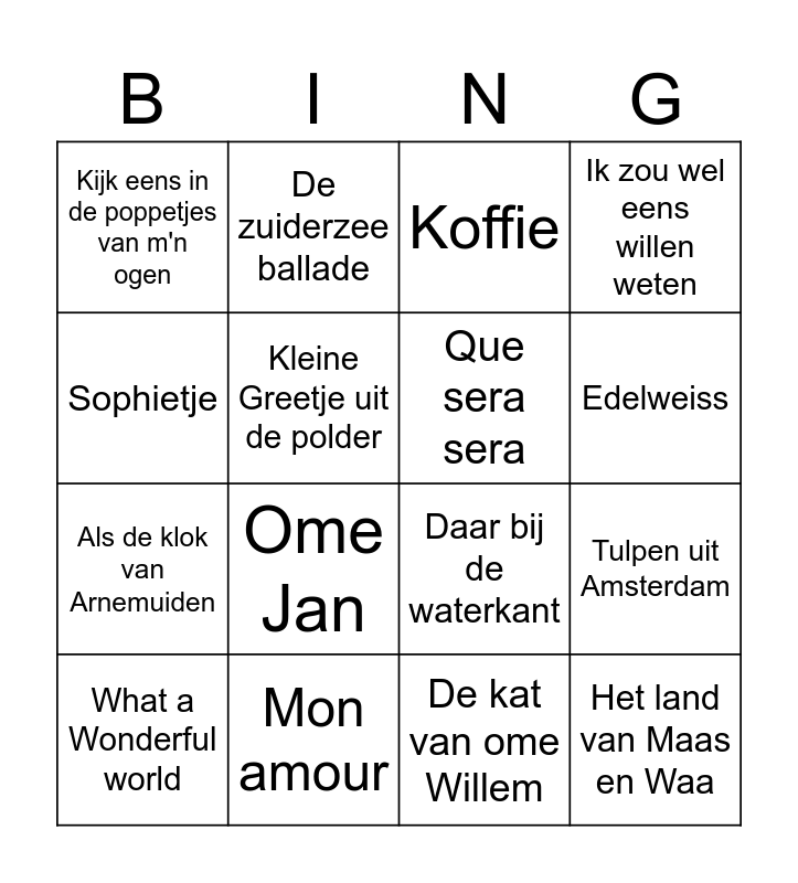 This bingo card has 16 words: Mon amour, Tulpen uit Amsterdam, Koffie, Kijk eens in de poppetjes van m'n ogen, Als de klok van Arnemuiden, De zuiderzee ballade, Daar bij de waterkant, De kat van ome Willem, Sophietje, Kleine Greetje uit de polder, What a Wonderful world, Ik zou wel eens willen weten, Ome Jan, Edelweiss, Que sera sera and Het land van Maas en Waa.