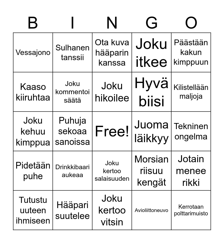 This bingo card has a free space and 24 words: Drinkkibaari aukeaa, Hääpari suutelee, Joku hikoilee, Tutustu uuteen ihmiseen, Päästään kakun kimppuun, Vessajono, Kaaso kiiruhtaa, Sulhanen tanssii, Juoma läikkyy, Joku kertoo salaisuuden, Hyvä biisi, Joku kehuu kimppua, Morsian riisuu kengät, Jotain menee rikki, Joku kommentoi säätä, Avioliittoneuvo, Tekninen ongelma, Ota kuva hääparin kanssa, Kilistellään maljoja, Puhuja sekoaa sanoissa, Kerrotaan polttarimuisto, Pidetään puhe, Joku itkee and Joku kertoo vitsin.