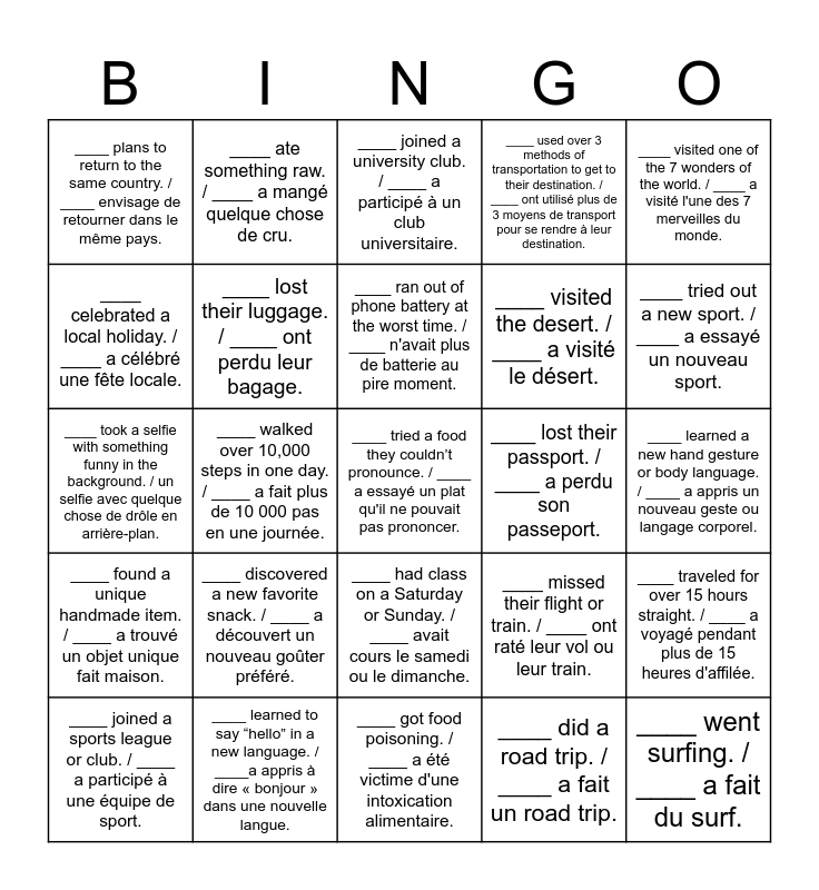 This bingo card has 51 words: ____ ate the national dish of the country. / ____ a mangé le plat national du pays., ____ tried a food they couldn’t pronounce. / ____ a essayé un plat qu'il ne pouvait pas prononcer., ____ was invited to a family gathering or celebration. / ____ a été invité une fête en famille., ____ got food poisoning. / ____ a été victime d'une intoxication alimentaire., ____ discovered a new favorite snack. / ____ a découvert un nouveau goûter préféré., ____ tried a local food, but didn't like it. / ____ a goûté un plat local, mais ne l'a pas aimé., ____ ate something raw. / ____ a mangé quelque chose de cru., ____ learned to cook a traditional recipe. / ____ a appris à cuisiner une recette traditionnelle., ____ celebrated a local holiday. / ____ a célébré une fête locale., ____ accidentally ate something too spicy. / ____ a accidentellement mangé quelque chose de trop épicé., ____ lost their luggage. / ____ ont perdu leur bagage., ____ used over 3 methods of transportation to get to their destination. / ____ ont utilisé plus de 3 moyens de transport pour se rendre à leur destination., ____ traveled for over 15 hours straight. / ____ a voyagé pendant plus de 15 heures d'affilée., ____ missed their flight or train. / ____ ont raté leur vol ou leur train., ____ got lost but enjoyed it. / ____ s'est perdu mais a apprécié., ____ navigated using only a paper map. / ____ a navigué à l'aide d'une carte en papier., ____ ran out of phone battery at the worst time. / ____ n'avait plus de batterie au pire moment., ____ lost their passport. / ____ a perdu son passeport., ____ visited more than 3 countries. / ____ a visité plus de 3 pays., ____ visited one of the 7 wonders of the world. / ____ a visité l'une des 7 merveilles du monde., ____ walked over 10,000 steps in one day. / ____ a fait plus de 10 000 pas en une journée., ____ did a road trip. / ____ a fait un road trip., ____ plans to return to the same country. / ____ envisage de retourner dans le même pays., ____ visited the desert. / ____ a visité le désert., ____ went skiing. / ____ a fait du ski., ____ went surfing. / ____ a fait du surf., ____ tried out a new sport. / ____ a essayé un nouveau sport., ____ bought a jersey or merchandise for a local sports team. / ____ a acheté un maillot ou des articles d'une équipe de sport locale., ____ joined a sports league or club. / ____ a participé à une équipe de sport., ____ joined a university club. / ____ a participé à un club universitaire., ____ learned a local dance. / ____ a appris une danse locale., ____ lived with a host family. / ____ a vécu avec une famille d'accueil., ____ pronounced a word incorrectly, leading to an embarrassing moment. / ____a mal prononcé un mot, entraînant un moment embarrassant., ____ made a very close friend. / ____ s'est fait un ami très proche., ____ learned a local language (not English, French, Spanish, German). / ____ a appris une langue locale (pas l'anglais, le français, l'espagnol ou l'allemand)., ____ learned to say “hello” in a new language. / ____a appris à dire « bonjour » dans une nouvelle langue., ____ taught someone about your home culture. / ____ a appris à quelqu'un sa culture d'origine., ____ learned a funny expression. / ____ a appris une drôle d'expression., ____ taught French or English. / ____ a enseigné le français ou l'anglais., ____ mastered a difficult pronunciation. / ____ a maîtrisé une prononciation difficile., ____ learned a new hand gesture or body language. / ____ a appris un nouveau geste ou langage corporel., ____ found a unique handmade item. / ____ a trouvé un objet unique fait maison., ____ saw a wild animal (outside the zoo). / ____ a vu un animal sauvage (en dehors du zoo)., ____ was homesick. / ____ avait le mal du pays., ____ took a photo in front of a famous landmark. / ____ a pris une photo devant un monument célèbre., ____ did something that scared you but turned out amazing. / ____ a fait quelque chose qui vous a effrayé mais qui s'est avéré extraordinaire., ____ took a selfie with something funny in the background. / un selfie avec quelque chose de drôle en arrière-plan., ____ shipped a package home because your suitcase was too full. / ____ a expédié un colis à la maison parce que sa valise était trop pleine., ____ woke up early to see the sunrise. / ____ s'est levé tôt pour voir le lever du soleil., ____ had class on a Saturday or Sunday. / ____ avait cours le samedi ou le dimanche. and ____ sent a postcard home. / ____ a envoyé une carte postale à son pays..