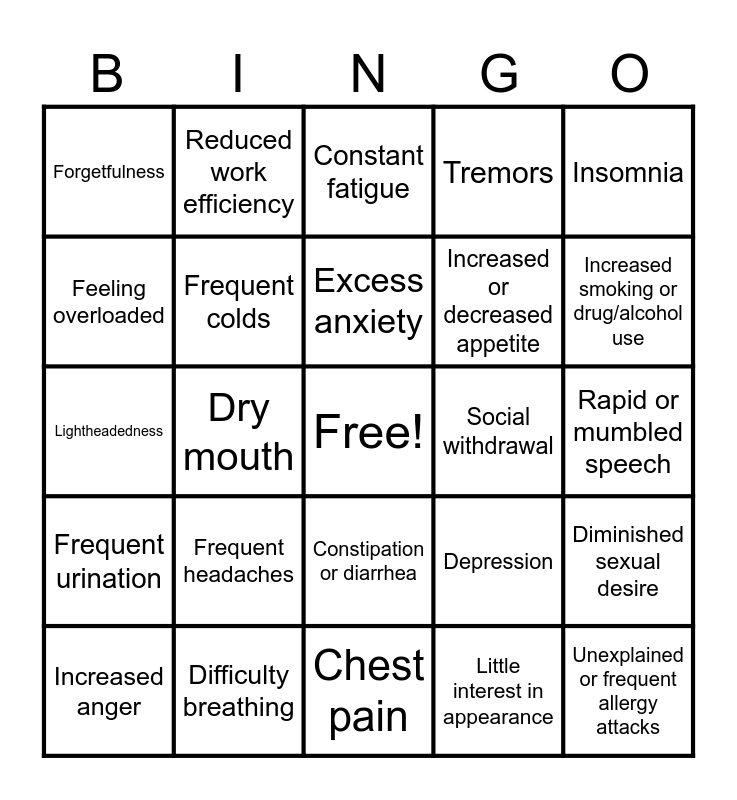 This bingo card has a free space and 24 words: Frequent headaches, Difficulty breathing, Excess anxiety, Increased anger, Insomnia, Forgetfulness, Feeling overloaded, Reduced work efficiency, Social withdrawal, Constipation or diarrhea, Increased or decreased appetite, Lightheadedness, Depression, Diminished sexual desire, Frequent colds, Little interest in appearance, Rapid or mumbled speech, Constant fatigue, Increased smoking or drug/alcohol use, Dry mouth, Unexplained or frequent allergy attacks, Frequent urination, Tremors and Chest pain.