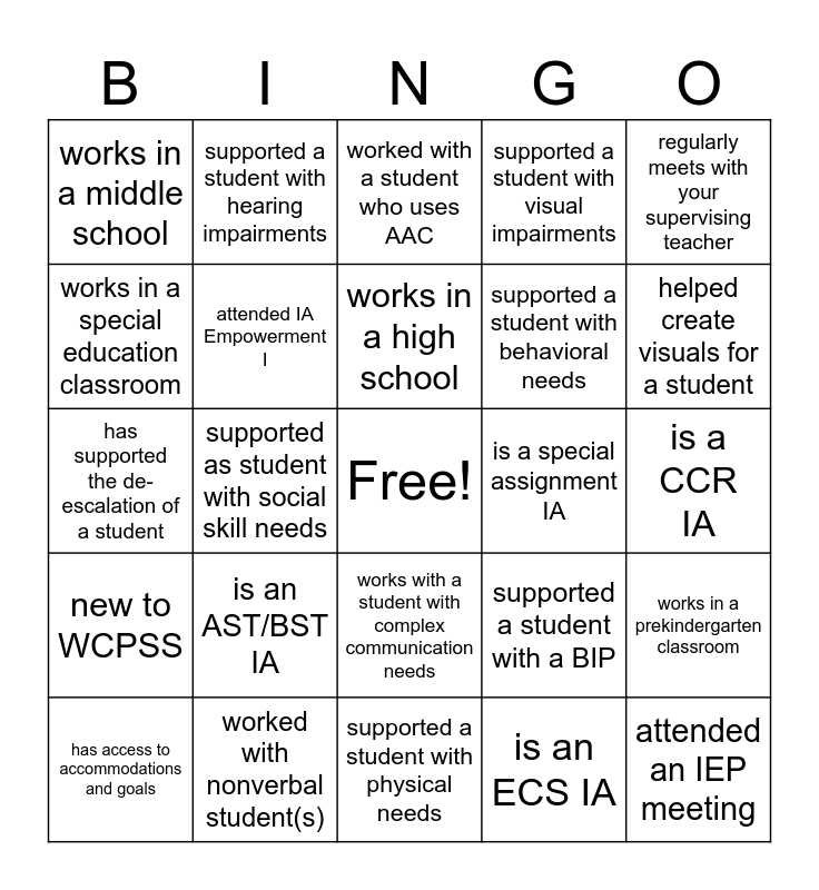 This bingo card has a free space and 27 words: supported a student with a BIP, works in an elementary school, supported a student with behavioral needs, supported a student with physical needs, works in a special education classroom, worked with a student who uses AAC, supported a student with hearing impairments, new to WCPSS, is a special assignment IA, works in a prekindergarten classroom, has supported the de-escalation of a student, supported a student with visual impairments, has access to accommodations and goals, worked with nonverbal student(s), helped create visuals for a student, supported a student with academic needs, attended IA Empowerment I, works in a high school, is an AST/BST IA, works in a middle school, is a CCR IA, is an ECS IA, supported as student with social skill needs, attended an IEP meeting, works with a student with complex communication needs, regularly meets with your supervising teacher and supported a student with social and emotional needs.