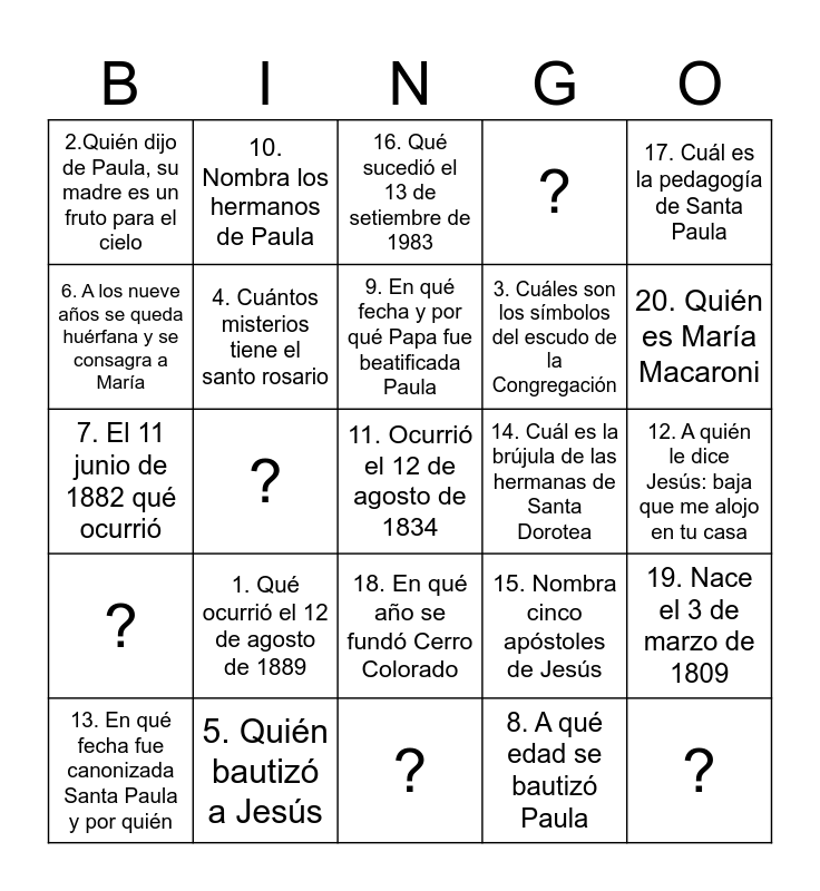 This bingo card has a free space and 24 words: 1. Qué ocurrió el 12 de agosto de 1889, 5. Quién bautizó a Jesús, 9. En qué fecha y por qué Papa fue beatificada Paula, 13. En qué fecha fue canonizada Santa Paula y por quién, 17. Cuál es la pedagogía de Santa Paula, 2.Quién dijo de Paula, su madre es un fruto para el cielo, 6. A los nueve años se queda huérfana y se consagra a María, 10. Nombra los hermanos de Paula, 14. Cuál es la brújula de las hermanas de Santa Dorotea, 18. En qué año se fundó Cerro Colorado, 3. Cuáles son los símbolos del escudo de la Congregación, 7. El 11 junio de 1882 qué ocurrió, 15. Nombra cinco apóstoles de Jesús, 19. Nace el 3 de marzo de 1809, 4. Cuántos misterios tiene el santo rosario, 8. A qué edad se bautizó Paula, 12. A quién le dice Jesús: baja que me alojo en tu casa, 16. Qué sucedió el 13 de setiembre de 1983, 20. Quién es María Macaroni, ?, ?, ?, ? and ?.