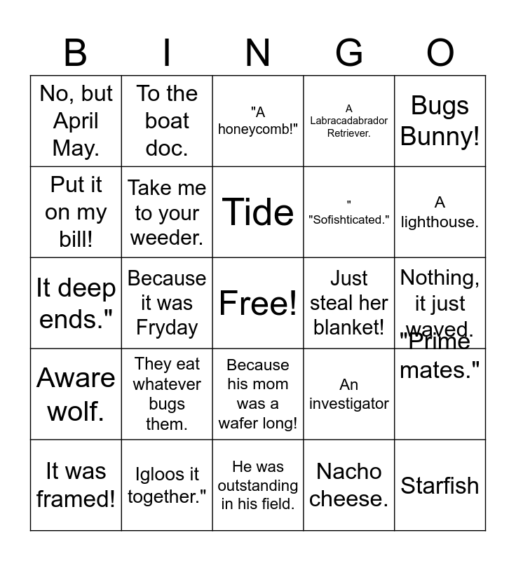 This bingo card has a free space and 39 words: But Catscan., What did one eye say to the other?, I noah guy., Take me to your weeder., It was framed!, Because his mom was a wafer long!, Tide, A poultry-geist., Bugs Bunny!, Aware wolf., Because it was Fryday, A Labracadabrador Retriever., Starfish, Nothing, it just waved., Just steal her blanket!, They eat whatever bugs them., Because Dawn is tough on Greece, No, but April May., Geology rocks but Geography is where it’s at!, An investigator, Put it on my bill!, He was outstanding in his field., " "Sofishticated.", A lighthouse., A satisfactory., I don't know y., Pear-is!, "Where's Pop Corn?", "The post office!", To the boat doc., "Stay here! I'm going on ahead.", He kept throwing away the bent ones., "A honeycomb!", Igloos it together.", Nacho cheese., Sneakers!", "Prime mates.", It deep ends." and He's probably going to croak..