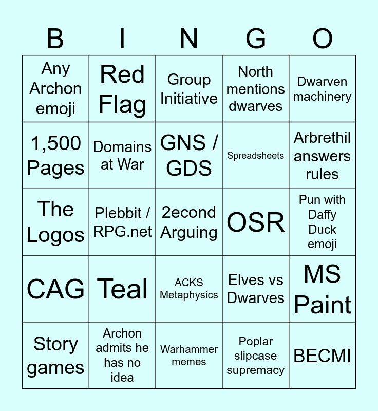 This bingo card has a free space and 24 words: Teal, Archon admits he has no idea, GNS / GDS, Story games, Dwarven machinery, Any Archon emoji, 1,500 Pages, Red Flag, OSR, ACKS Metaphysics, Spreadsheets, The Logos, Elves vs Dwarves, MS Paint, Domains at War, Poplar slipcase supremacy, Pun with Daffy Duck emoji, Group Initiative, Arbrethil answers rules, Plebbit / RPG.net, BECMI, CAG, North mentions dwarves and Warhammer memes.
