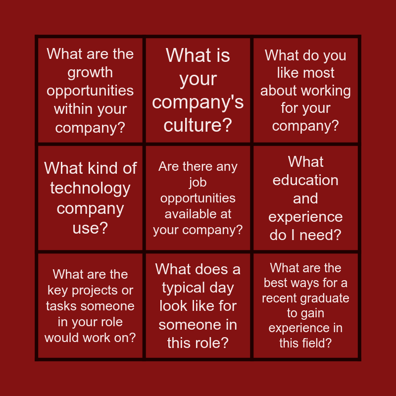 This bingo card has a free space and 8 words: What education and experience do I need?, What do you like most about working for your company?, What is your company's culture?, What are the key projects or tasks someone in your role would work on?, What are the growth opportunities within your company?, What are the best ways for a recent graduate to gain experience in this field?, What kind of technology company use? and What does a typical day look like for someone in this role?.