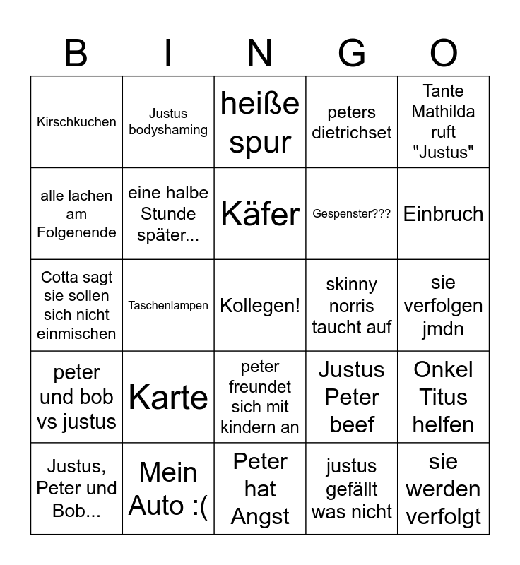 This bingo card has 25 words: Karte, Peter hat Angst, Käfer, Justus, Peter und Bob..., Tante Mathilda ruft "Justus", Kirschkuchen, alle lachen am Folgenende, Justus bodyshaming, skinny norris taucht auf, peter freundet sich mit kindern an, Gespenster???, Cotta sagt sie sollen sich nicht einmischen, Justus Peter beef, Onkel Titus helfen, eine halbe Stunde später..., sie werden verfolgt, sie verfolgen jmdn, heiße spur, Einbruch, Taschenlampen, Kollegen!, Mein Auto :(, peter und bob vs justus, peters dietrichset and justus gefällt was nicht.