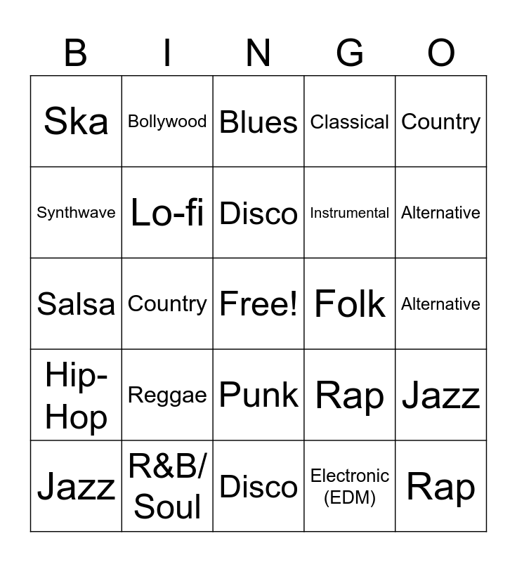 This bingo card has a free space and 45 words: Rock, Rap, Pop, Jazz, Hip-Hop, Electronic (EDM), Blues, Metal, Country, R&B/ Soul, Classical, Folk, Punk, Reggae, Synthwave, Disco, Techno, Salsa, Instrumental, Alternative, Bollywood, Gospel, Lo-Fi, Ska, Rock, Alternative, Metal, Pop, Rap, Hip-Hop, R&B Soul, Jazz, Blues, Folk, Ska, Country, Classical, Techno, Electronic EDM, Disco, Synthwave, Instrumental, Gospel, Lo-fi and Bollywood.