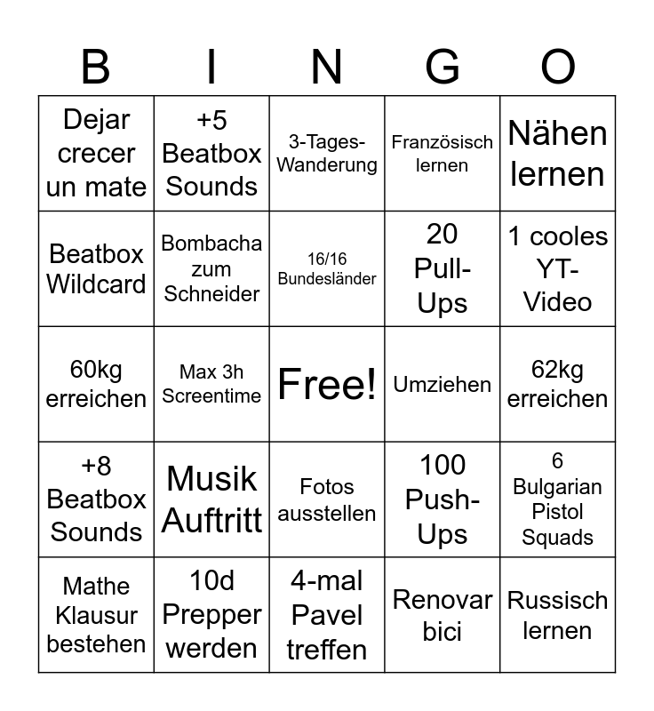 This bingo card has a free space and 24 words: Musik Auftritt, 10d Prepper werden, 16/16 Bundesländer, Mathe Klausur bestehen, Nähen lernen, Dejar crecer un mate, Beatbox Wildcard, +5 Beatbox Sounds, Umziehen, Fotos ausstellen, 20 Pull-Ups, 60kg erreichen, 100 Push-Ups, 6 Bulgarian Pistol Squads, Bombacha zum Schneider, Renovar bici, 62kg erreichen, 3-Tages-Wanderung, 1 cooles YT-Video, Max 3h Screentime, Russisch lernen, +8 Beatbox Sounds, Französisch lernen and 4-mal Pavel treffen.