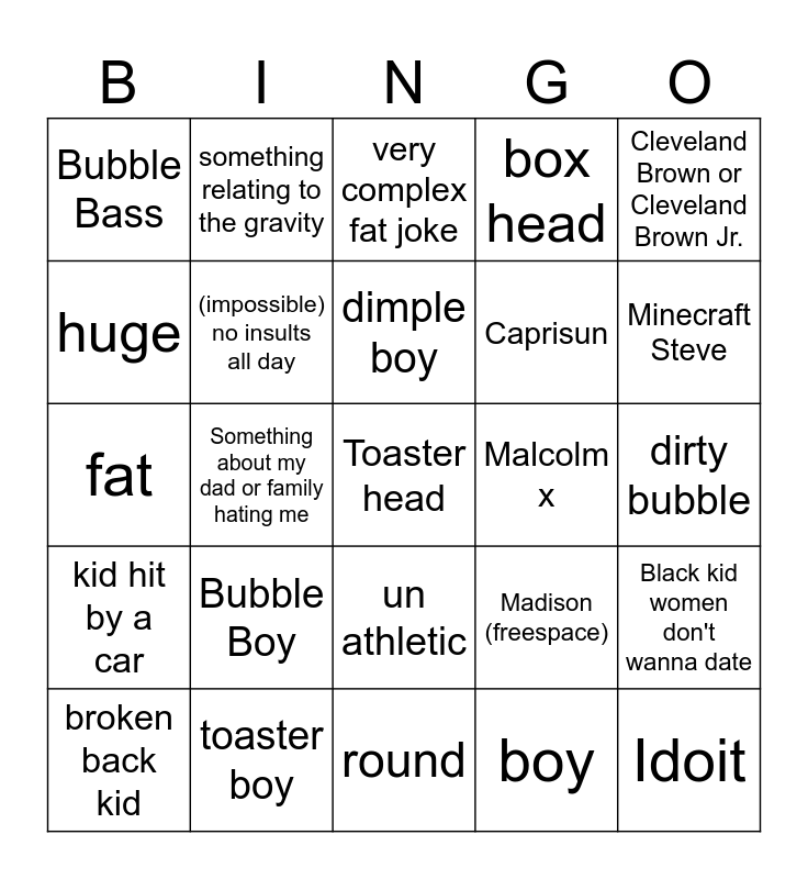 This bingo card has 25 words: Bubble Boy, round, dimple boy, broken back kid, Cleveland Brown or Cleveland Brown Jr., Bubble Bass, huge, something relating to the gravity, Malcolm x, un athletic, Caprisun, fat, Madison (freespace), Black kid women don't wanna date, (impossible) no insults all day, Idoit, dirty bubble, very complex fat joke, Minecraft Steve, Something about my dad or family hating me, Toaster head, toaster boy, kid hit by a car, box head and boy.
