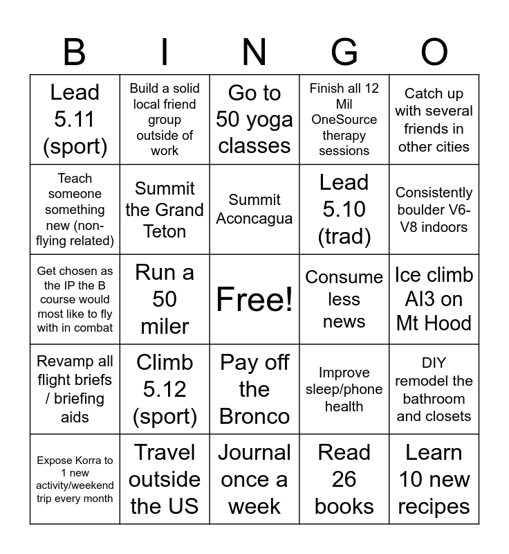 This bingo card has a free space and 24 words: Climb 5.12 (sport), Travel outside the US, Summit Aconcagua, Expose Korra to 1 new activity/weekend trip every month, Catch up with several friends in other cities, Lead 5.11 (sport), Teach someone something new (non-flying related), Build a solid local friend group outside of work, Consume less news, Pay off the Bronco, Lead 5.10 (trad), Get chosen as the IP the B course would most like to fly with in combat, Improve sleep/phone health, DIY remodel the bathroom and closets, Summit the Grand Teton, Read 26 books, Ice climb AI3 on Mt Hood, Go to 50 yoga classes, Consistently boulder V6-V8 indoors, Run a 50 miler, Learn 10 new recipes, Revamp all flight briefs / briefing aids, Finish all 12 Mil OneSource therapy sessions and Journal once a week.