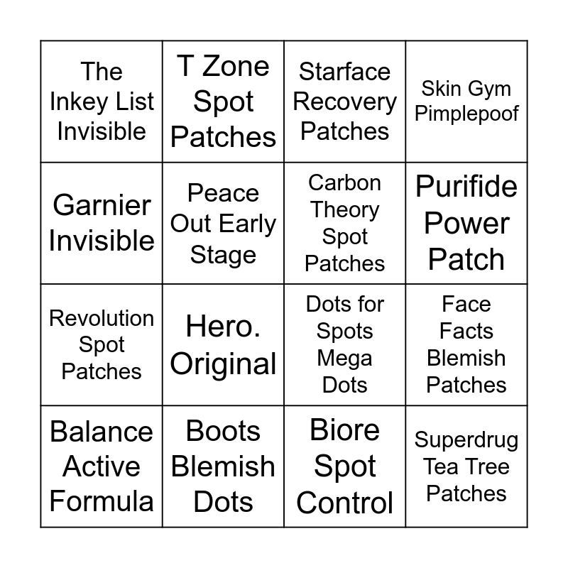 This bingo card has 16 words: Boots Blemish Dots, Face Facts Blemish Patches, Starface Recovery Patches, The Inkey List Invisible, Revolution Spot Patches, T Zone Spot Patches, Dots for Spots Mega Dots, Biore Spot Control, Garnier Invisible, Peace Out Early Stage, Balance Active Formula, Skin Gym Pimplepoof, Hero. Original, Purifide Power Patch, Carbon Theory Spot Patches and Superdrug Tea Tree Patches.