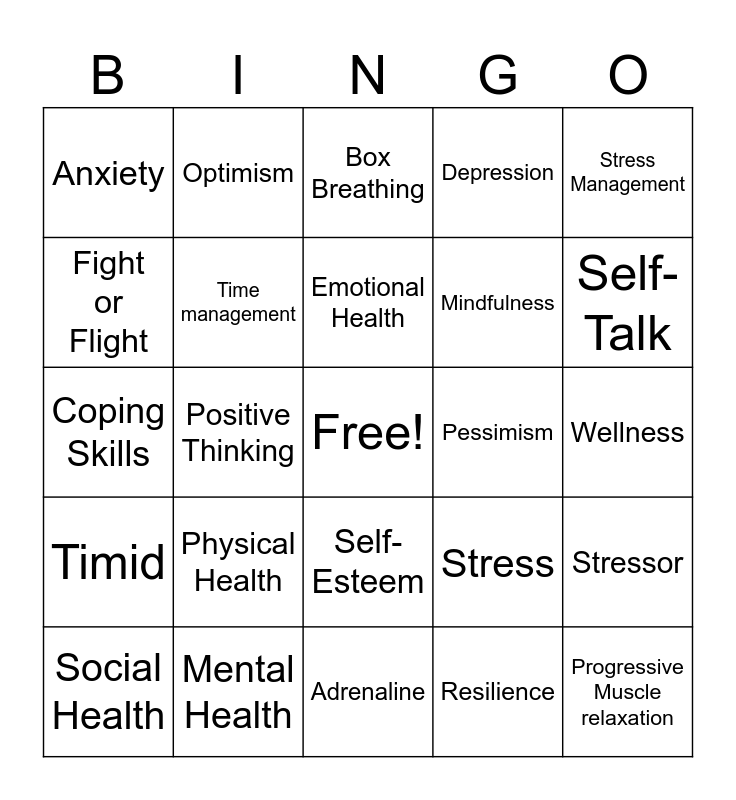 This bingo card has a free space and 24 words: Physical Health, Mental Health, Emotional Health, Social Health, Stress Management, Anxiety, Fight or Flight, Optimism, Pessimism, Self-Esteem, Mindfulness, Coping Skills, Stress, Stressor, Time management, Resilience, Wellness, Box Breathing, Self-Talk, Positive Thinking, Progressive Muscle relaxation, Timid, Depression and Adrenaline.