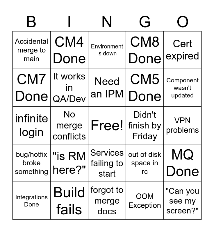 This bingo card has a free space and 30 words: Build fails, Spreadsheet done before Thursday, No merge conflicts, .npmrc issues, Accidental merge to main, Environment is down, It works in QA/Dev, Services failing to start, Didn't finish by Friday, forgot to merge docs, VPN problems, "Can you see my screen?", OOM Exception, master.json problems, Component wasn't updated, code frozen, out of disk space in rc, bug/hotfix broke something, "is RM here?", Cert expired, infinite login, CM3 Done, CM4 Done, CM5 Done, CM7 Done, CM8 Done, MQ Done, Integrations Done, Need an IPM and Visualize Down.
