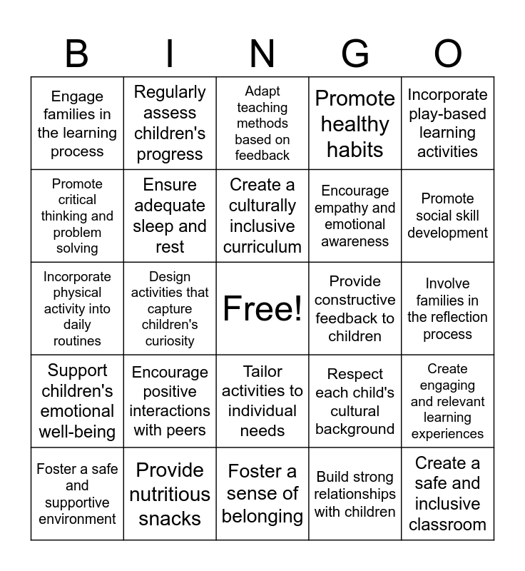 This bingo card has a free space and 24 words: Encourage positive interactions with peers, Provide nutritious snacks, Create a culturally inclusive curriculum, Foster a safe and supportive environment, Incorporate play-based learning activities, Engage families in the learning process, Promote critical thinking and problem solving, Regularly assess children's progress, Provide constructive feedback to children, Tailor activities to individual needs, Encourage empathy and emotional awareness, Incorporate physical activity into daily routines, Respect each child's cultural background, Create engaging and relevant learning experiences, Ensure adequate sleep and rest, Build strong relationships with children, Involve families in the reflection process, Adapt teaching methods based on feedback, Promote social skill development, Design activities that capture children's curiosity, Create a safe and inclusive classroom, Support children's emotional well-being, Promote healthy habits and Foster a sense of belonging.