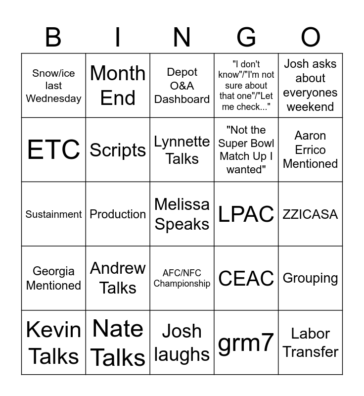 This bingo card has a free space and 24 words: Andrew Talks, Nate Talks, Lynnette Talks, Kevin Talks, Josh asks about everyones weekend, Snow/ice last Wednesday, ETC, Month End, LPAC, AFC/NFC Championship, "Not the Super Bowl Match Up I wanted", Sustainment, CEAC, Grouping, Scripts, grm7, ZZICASA, Depot O&A Dashboard, Aaron Errico Mentioned, Production, Labor Transfer, Georgia Mentioned, "I don't know"/"I'm not sure about that one"/"Let me check..." and Josh laughs.