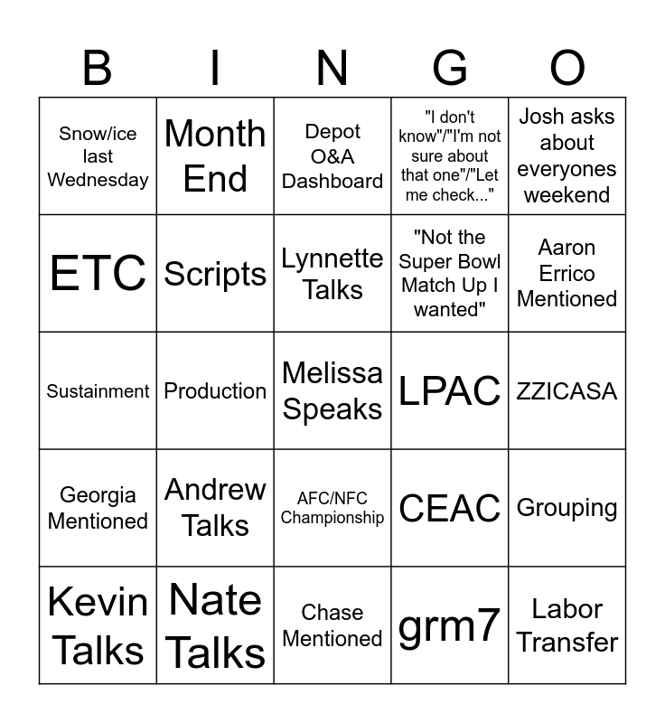 This bingo card has a free space and 24 words: Andrew Talks, Nate Talks, Lynnette Talks, Kevin Talks, Josh asks about everyones weekend, Snow/ice last Wednesday, ETC, Month End, LPAC, AFC/NFC Championship, "Not the Super Bowl Match Up I wanted", Sustainment, CEAC, Grouping, Scripts, grm7, ZZICASA, Depot O&A Dashboard, Aaron Errico Mentioned, Production, Labor Transfer, Georgia Mentioned, "I don't know"/"I'm not sure about that one"/"Let me check..." and Chase Mentioned.